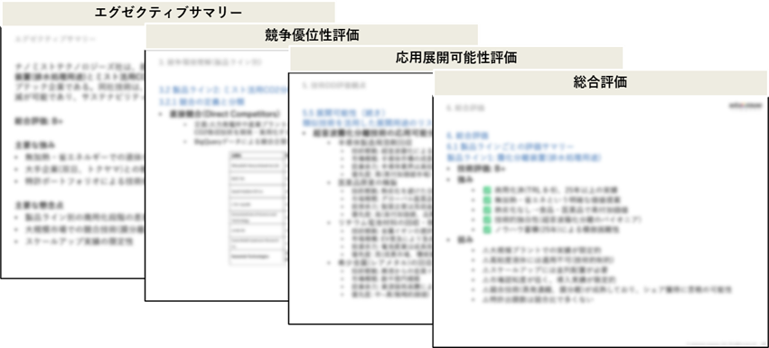 ▼レポートアウトプットイメージ(対象企業の規模・保有技術種類にもよりますが、平均で50~150ページ程になります)