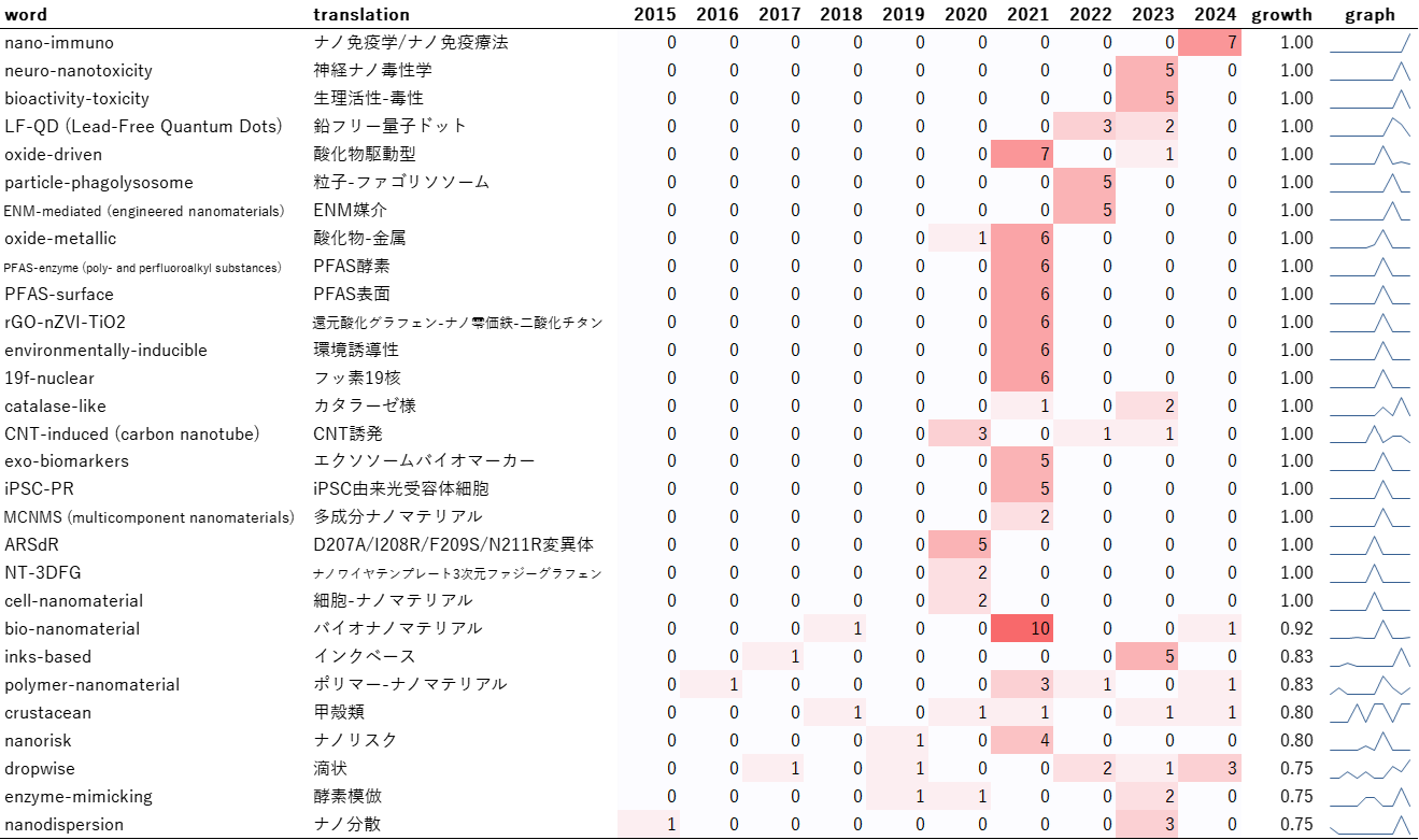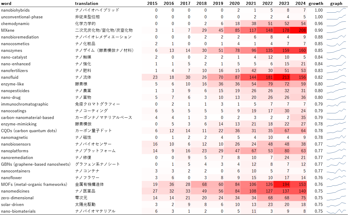 「MXene(マキシン:2次元ナノ材料の総称)」、「nanozymes(酵素模倣ナノ材料)」、「nanofluid(ナノ流体)」といったキーワードは、0.8以上の高い成長度をしめし、高頻度で出現しています。