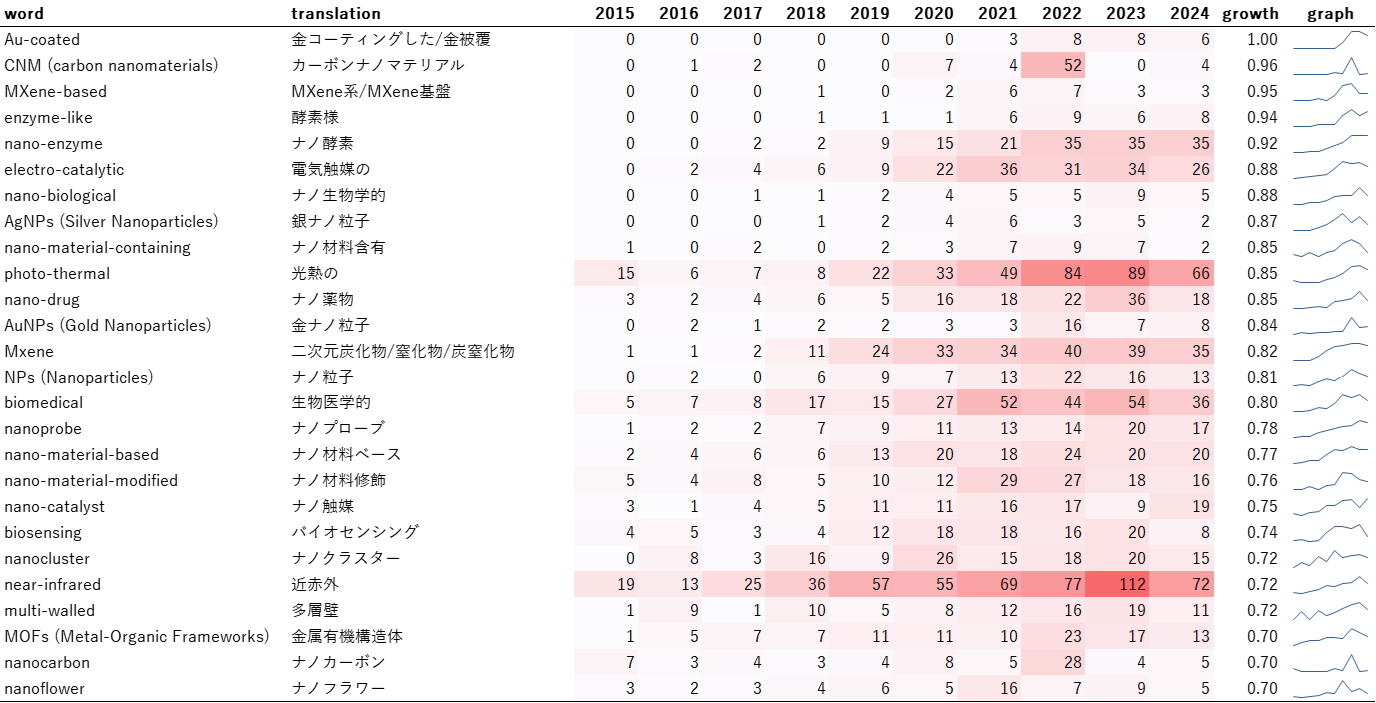 成長度が1のキーワードは「Au-coated(金コーティング)」だけです。金コーティング自体はプラズモン関連で古くから研究されている歴史の長い技術です。フラーレンやカーボンナノチューブ、グラフェンのような「CNM(カーボンナノマテリアル)」や「MXene」、「photo-thermal(光熱変換の)」や「biosensing(バイオセンシング)」、「electro-catalytic(電気触媒)」や「nano-catalysis(ナノ触媒)」などといったキーワードの技術と関連してその技術が再燃し、上位にあらわれたものと推測されます。金の優れた化学安定性、生体適合性、プラズモニック特性を活用し、SERS基板、バイオセンサー、抗菌材料、光熱療法、触媒への応用研究が活発に行われています。
