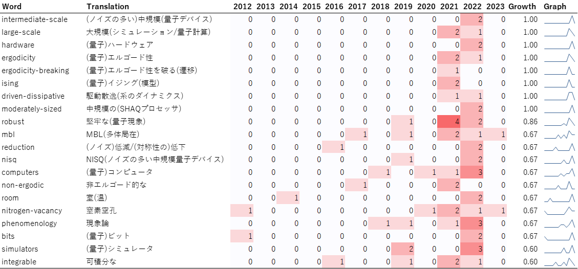 近年増加傾向にあり出現回数も多いキーワードとしては「prethermal (ization)」(前熱化/プレサーマリゼーション:量子系でみられる非自明な準非平衡定常状態)、「DTCs」(離散時間結晶:外部駆動周期の整数倍周期で自発的に振動する時間結晶)など、時間結晶をはじめとする非平衡系特有の物理現象の名称、あわせて「qubits」(量子ビット)など量子コンピュータに関する単語が出現しています。近年世界各国で基礎研究、実証研究が強力に推進されている量子コンピューティングへの応用を見すえた研究がさかんに実施されていると考えられます。