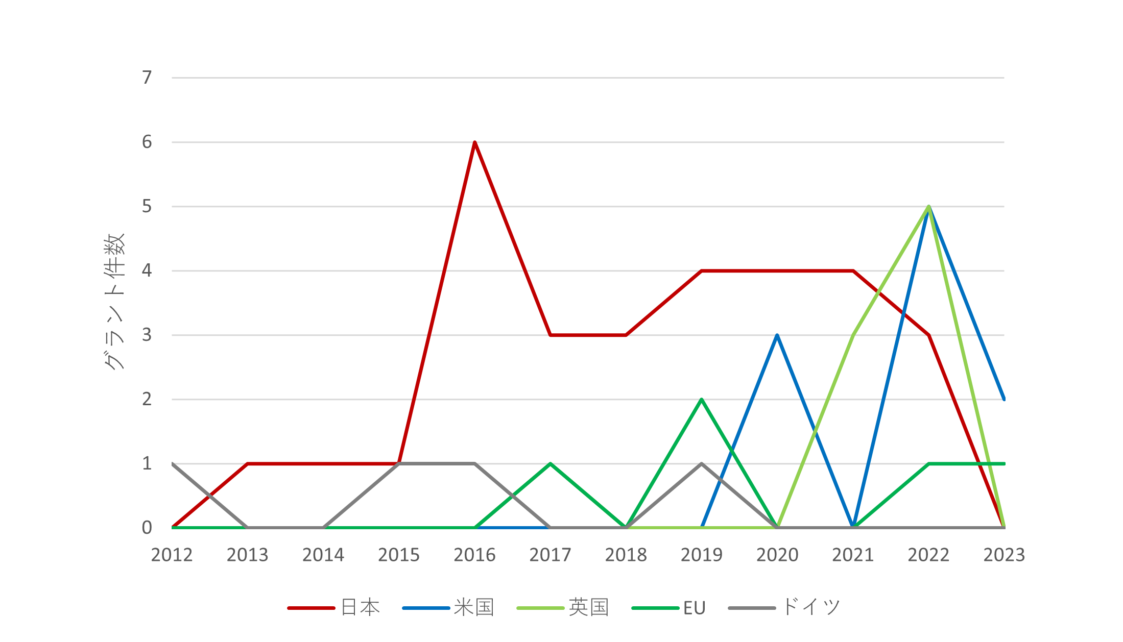配賦額では、2016年以降継続的に増加傾向にあるEUが最多であり、2020年を境に大幅な急伸傾向にある英国、さらに日本、米国、フランスが続いています。上記傾向より、日本では時間結晶の概念が提唱された翌年の2013年から多様な研究に資金が継続的に配賦されている一方、EUや英国では競争力の強い大型研究プロジェクトに資金が集中している、という動向が読みとれます。