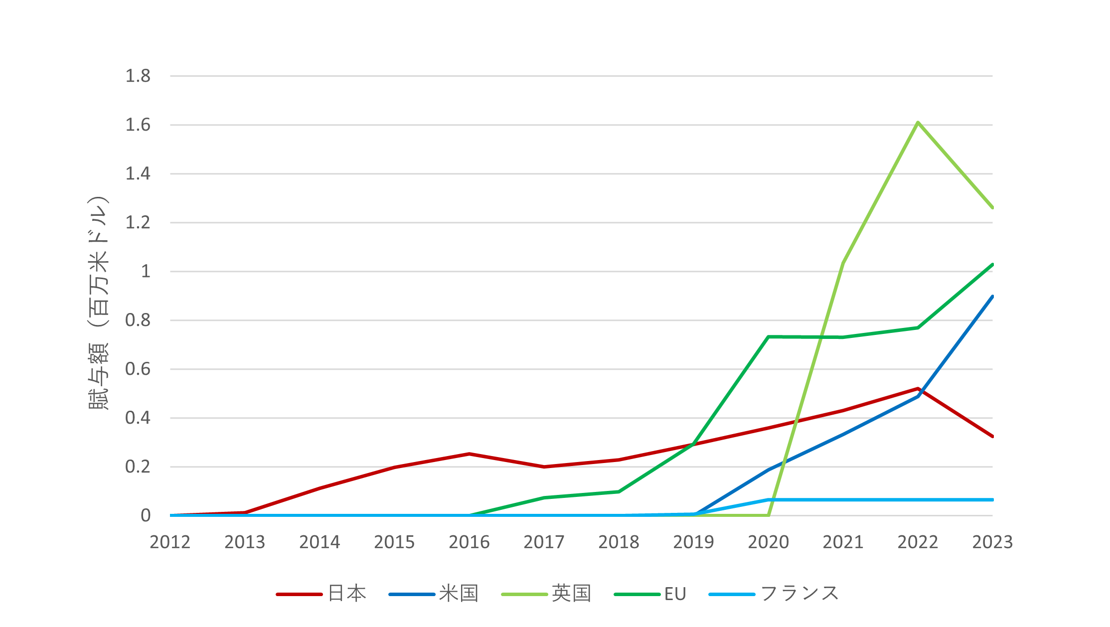 続いて、グラントの件数および配賦額を確認します。時間結晶技術に関連するグラントの国別件数の年次推移が図4、国別配賦額の年次推移が図5です。ただし、中国はグラントデータの開示状況が年次によりおおきく異なり、実態を反映しない可能性が高いことから集計より除外しています。また、公開直後のグラント情報にはデータベースに格納されていないものもあり、直近の集計値については過小評価されている場合があります。
