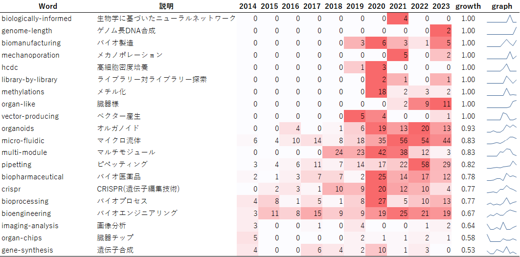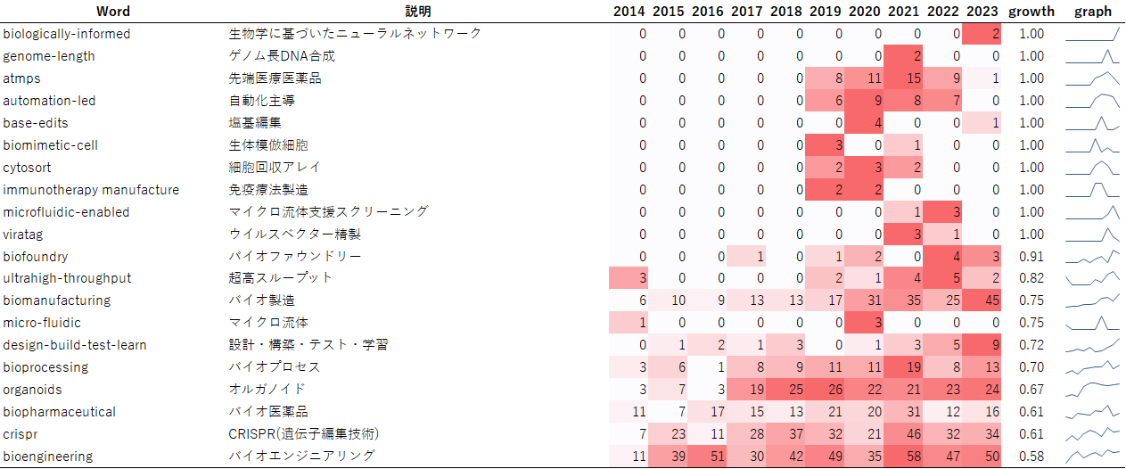 図1は2014年から2023年まで10年間の、バイオDXに関わるグラントの研究概要にふくまれる特徴的なキーワードの年次推移です。