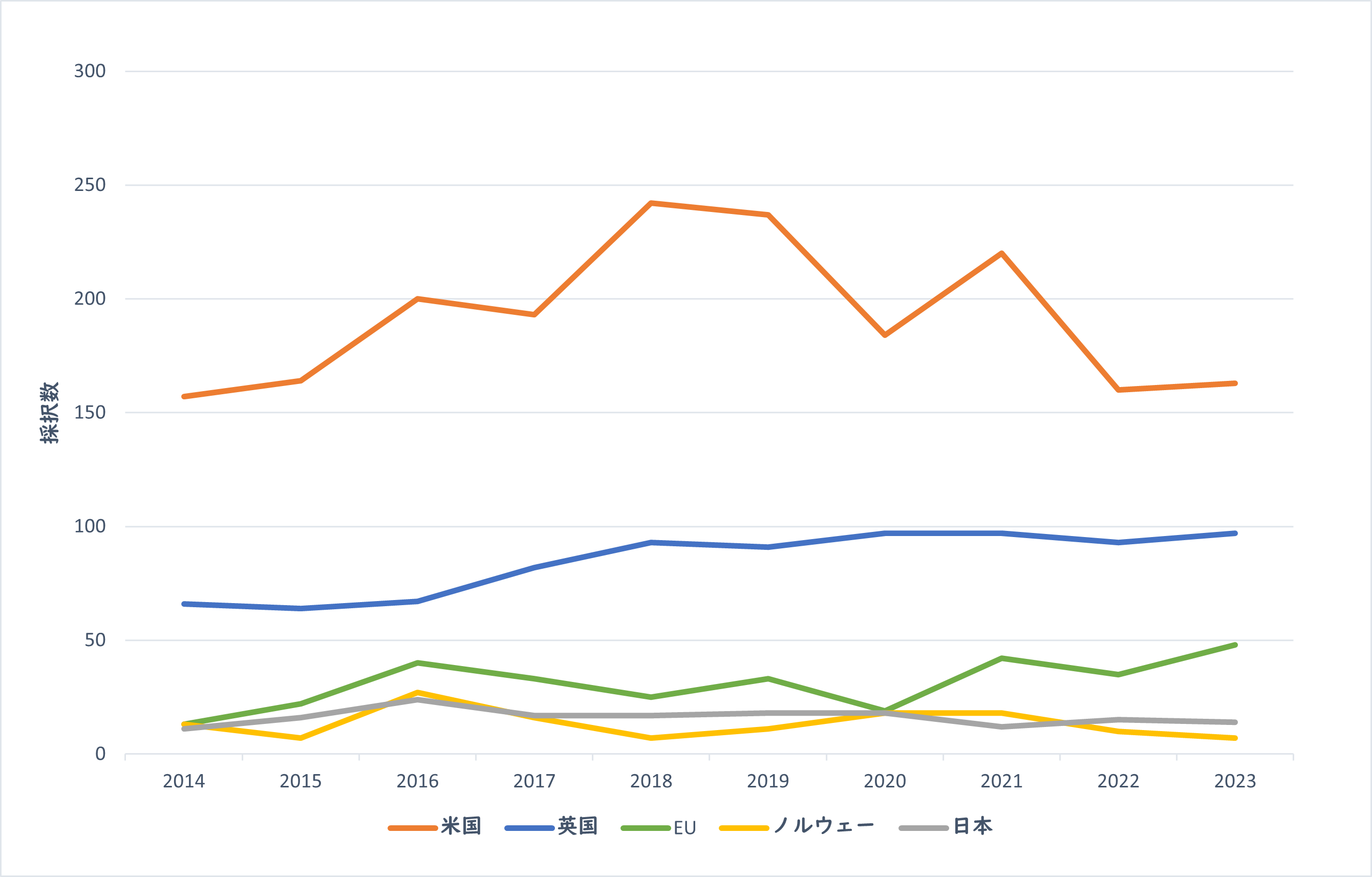 つづいて図2は、2014年から2023年までの、バイオDXに関連するグラントプロジェクトの件数が上位5か国の動向です。ただし、中国はグラントデータを非公開としており、実態を反映していない可能性が高いため除外しました。また、公開直後のグラント情報にはデータベースに格納されていないものもあり、直近の集計値については過小評価されている可能性があります。