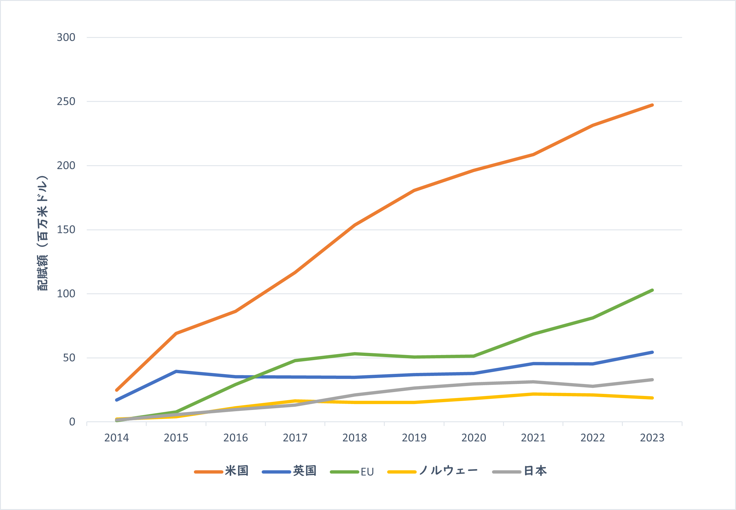 件数も研究配賦額も、どちらも米国が1位となっており、配賦額は増加傾向にあります。EUがそれを追い2020年ごろから件数と額を増やしているものの、米国と他国には大きな差があります。