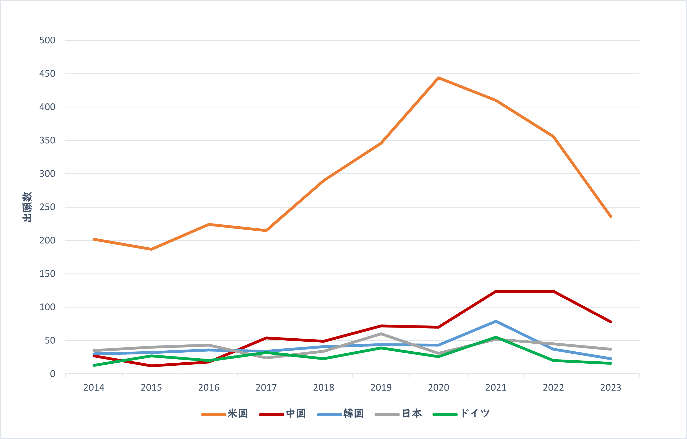 2021年以降、特許出願の増加が各国で停滞気味であるように見えます。ちょうどこの時期、COVID-19の影響などによる不景気や不安の広がりが原因で、バイオテクノロジーに対する民間による投資が減少し、「Biotech Winter」とよばれました。不景気で投資に消極的な状況下では、プラットフォームのような一般市民が手にとれる製品には即座につながらない研究は外部投資家の評価をうけにくくなります。その結果、各企業においては、有用製品の製造成果に関する特許出願が優先されたと考えられます。