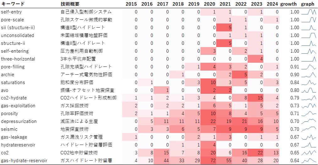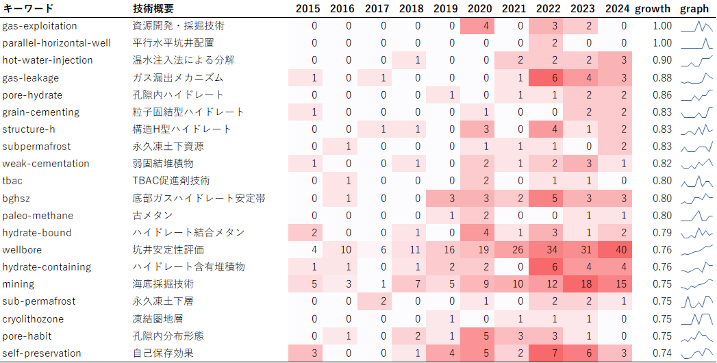 分析の結果、「depressurization(減圧法)」、「self-entering(自動制御)」、「three-horizontal(3本水平坑井)」、「gas-exploitation(ガス採掘)」といった、掘削・生産関連のキーワードが増加していることがわかります。深海のメタンハイドレートの採取は、井戸を掘って圧力を下げる「減圧法」が基本です。このとき、自動制御システムによりガスの産出量や地層の安定性を監視し、効率的で安全な操業を実現しています。また、複数の水平坑井を配置することで、広い範囲からガスを効率よく回収する設計が重要です。