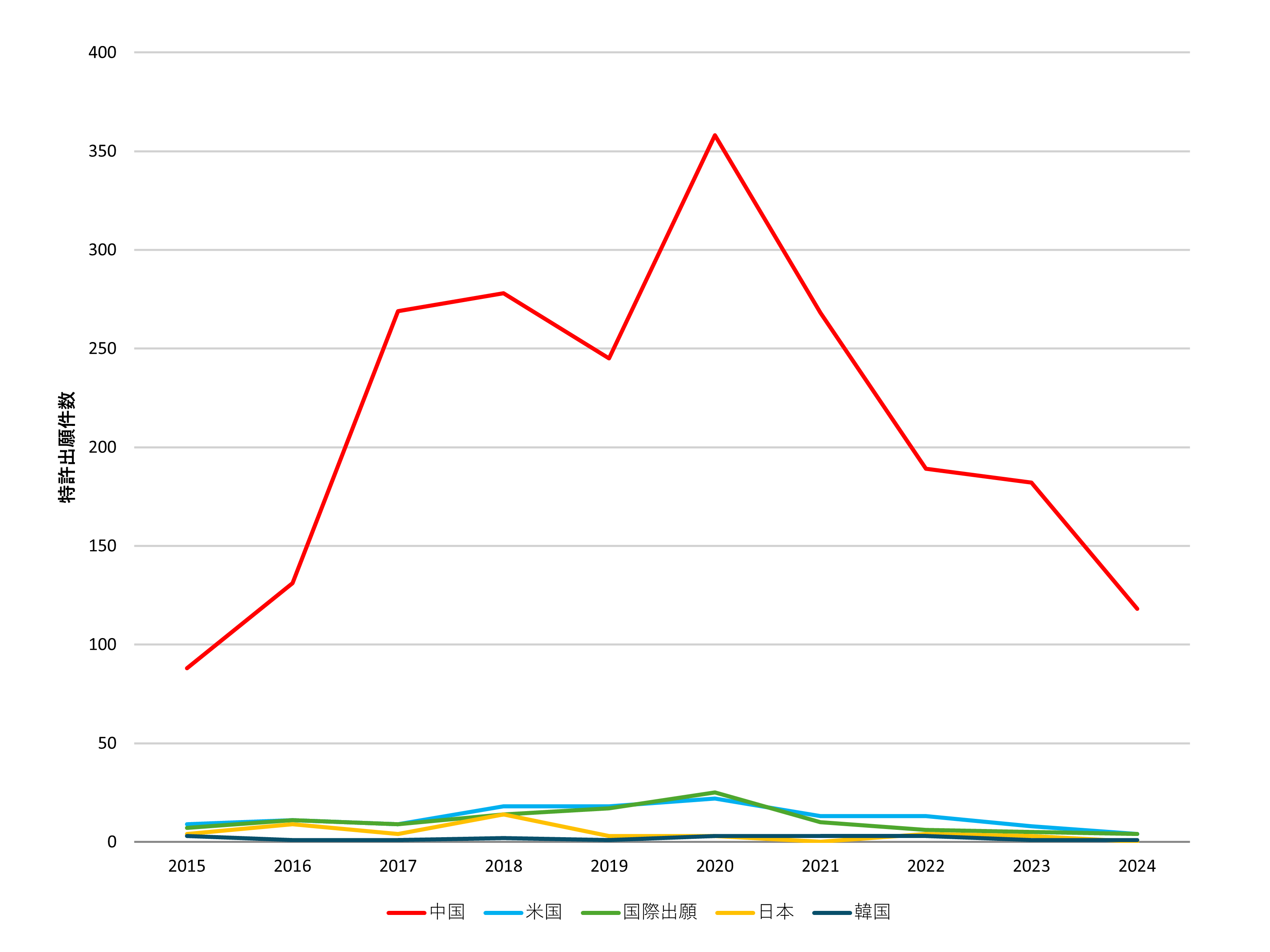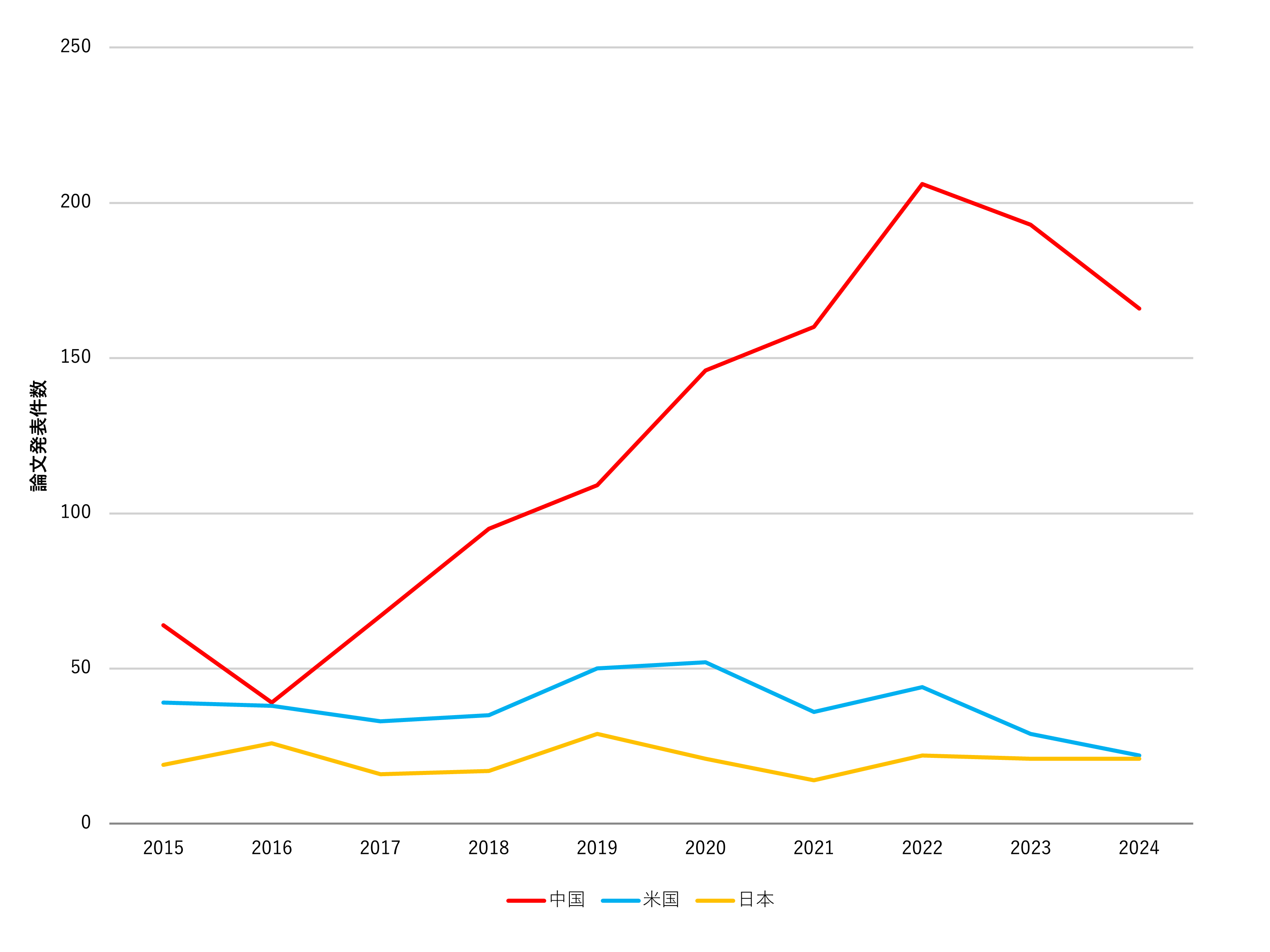 中国の論文発表数が2015年以降に急増し、2023年にはピークをむかえて全体の約半数を占めるまでになりました。米国と日本は安定して論文を発表し続けており、分野の基礎研究を継続的にささえています。