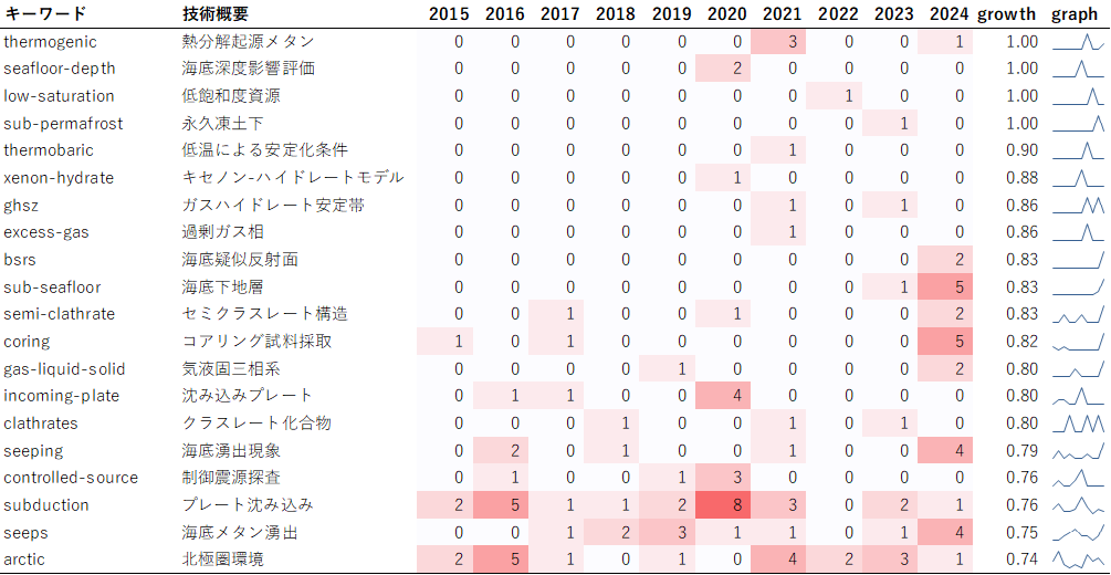さらに、「sub-permafrost(永久凍土下)」、「cryolithozone(凍結圏地層)」、「bghsz(底部ガスハイドレート安定帯)」といったキーワードの増加も見られます。これらは、北極圏や高緯度地域における陸域メタンハイドレート資源の研究が活発化していることをしめしています。永久凍土下に存在するハイドレートは、海洋よりも温度・圧力の制御が容易で、比較的低コストで実験できる利点があります。そのため、長期的なガス産出試験を実施しやすく、将来的な商業化を見すえた「実証実験場」として注目されています。実際に、日本の独立行政法人エネルギー・金属鉱物資源機構(JOGMEC)がアラスカ永久凍土地域での長期産出試験を実施し、10か月以上にわたるガス生産に成功したことを報告しています。