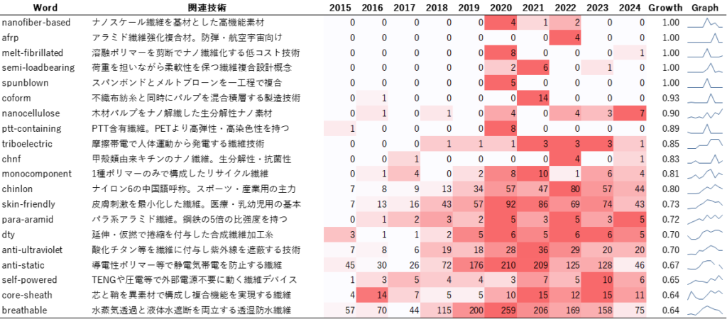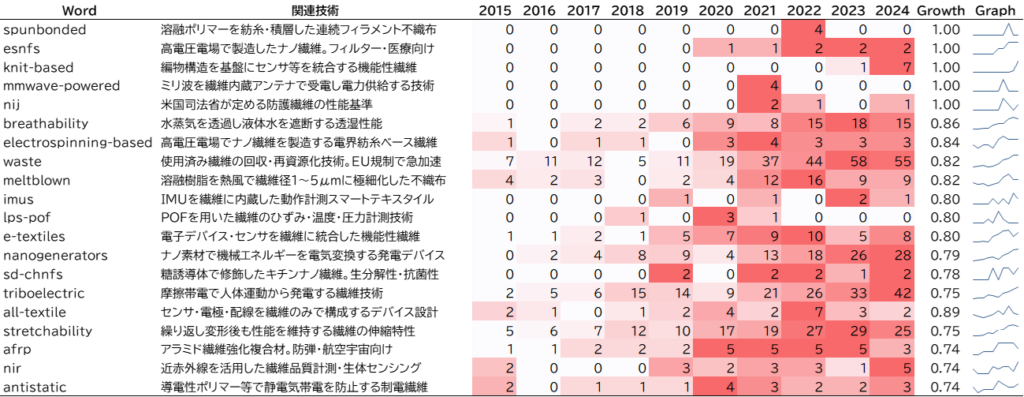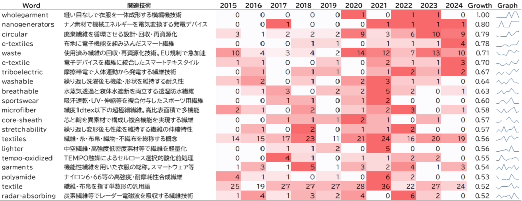 特許動向からは、「triboelectric(摩擦帯電)」「self-powered(自己発電)」「core-sheath(芯鞘構造)」といった、スマートテキスタイル基盤技術の出願が2018年以降、一貫して増加しており、バッテリーレス型ウェアラブルへの実用化が特許段階に移行しつつあります。また「waste(廃棄繊維)」関連の出願が分析期間を通じてもっとも増加しており、循環型繊維産業への移行が特許活動にも明確に反映されています。国別では中国の急増がつづく一方、日本の大手素材企業も高付加価値および高強度領域で引きつづき上位を維持しています。