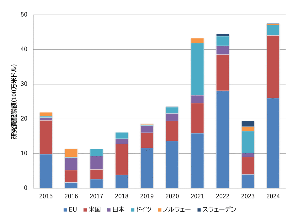 日本は配賦額こそ多くないものの、継続的な投資が見られます。なお、中国のデータがふくまれていないため、全世界における実際の投資規模は過小評価されている可能性があります。
