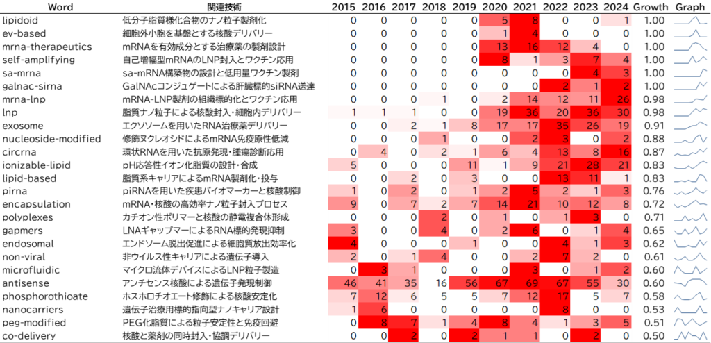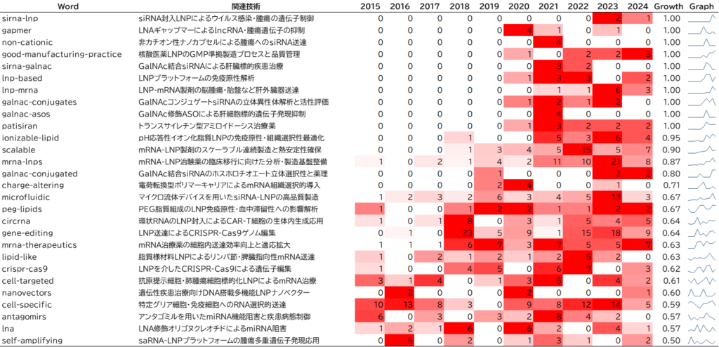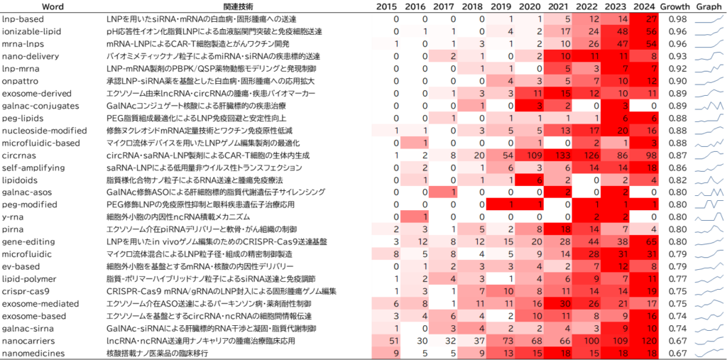 特許分析からは、実用化段階に向けた技術の成熟が顕著に読み取れます。特に「lipidoid(脂質様物質:従来の脂質を改良した薬物運搬材料)」「sa-mRNA(自己増幅型mRNA:細胞内で自分自身をコピーして増殖できるmRNA)」「GalNAc-siRNA(N-アセチルガラクトサミン修飾siRNA:肝臓に選択的に届くsiRNA)」といったキーワードの成長は、核酸をつつんで運ぶ技術の多様化、少ない投与量でより長期間効果を発現させる応用拡大、特定の組織を狙ったsiRNA送達の実用化が進展していることを示しています。