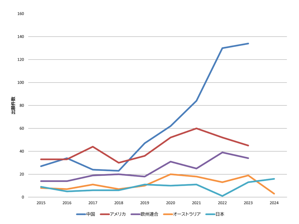 つづいて、特許出願数の国別動向です。企業や研究機関の出願する特許の傾向には、社会実装が近い、あるいはすでに実装済みである技術と関連する短中期の動向が反映されます。