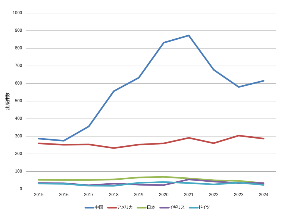 国別の論文出版件数でも、中国が突出しています。2020年ごろから急増していた特許出願件数に先行するように、2018年ごろから論文出版件数が急増しています。この時期に得られた研究成果が数年後に特許として出願され、社会実装されつつある可能性が考えられます。