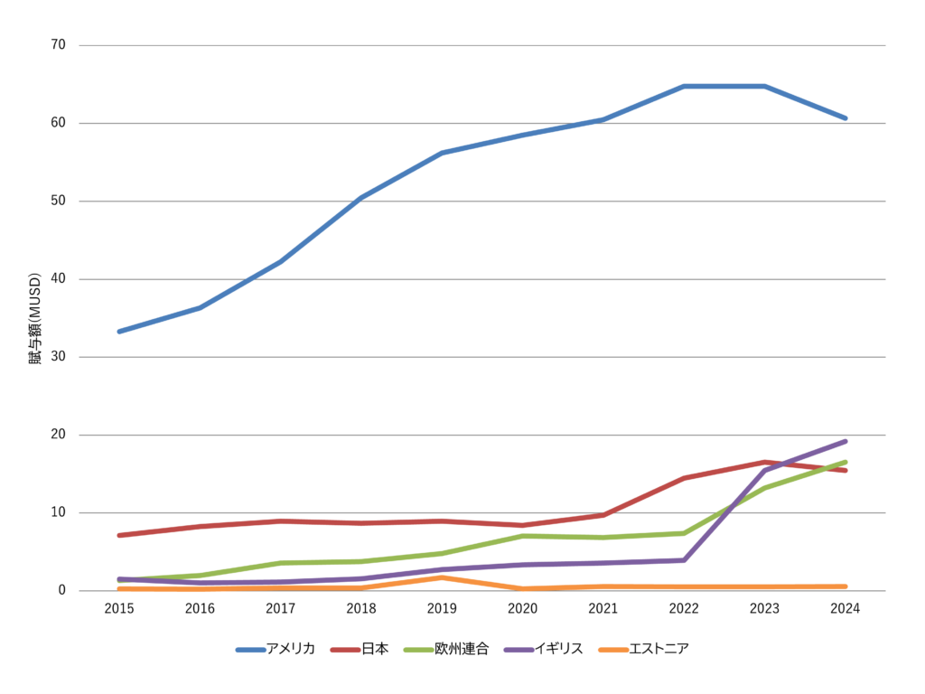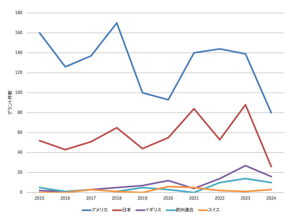 グラントの件数ではアメリカが最多ですが、日本も一定数が確認されます。賦与額はアメリカが圧倒的に多く、日本なども増加傾向にあります。日本のグラント数については、日本学術振興会や日本医療研究開発機構(AMED)などによる支援が継続されていることが要因です。